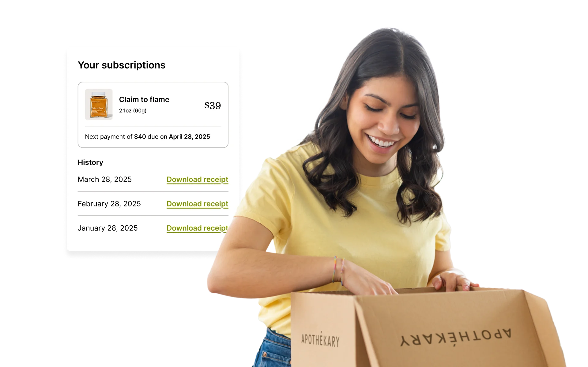 A person smiling while opening a box with the Apothékary logo and checking their subscription details.